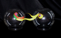BONDING BETWEEN ATOMS Atoms bond to each other in various combinations to create molecules. It is a larger topic than I wish to explore here and much material exists on the web. The Chemguide source listed above has some nice explanations. But before we close this article, I would like to show how, in the system of the saddlemniscus, one electron can be shared by two different atoms. Most of the schemes for bonding rely on electrons acting as links between atoms or molecules. This is a simple matter for the electron as we have described it. The illustrations below are of the same paper ribbon we photographed for Figures 3, 4 and 5. It was merely unwound at one end, stretched out and rewound. Then each end was attached to a fishbowl. Our little paper toys have the ability to explain matter, energy, atomic structure and molecular bonding. There is more to it of course but that will have to wait for another time.