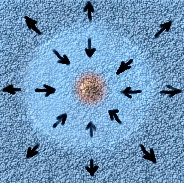 ATTRACTION AND REPULSION Returning for a moment to the electron, since it has now also transitioned into a 3-D object, it would also forbid the penetration by additional veil. In its free form, it has collapsed around the void hole. So its net effect upon the surrounding veil will be to pull it inwards. The distortion will be the opposite of that created by a proton. It is this opposition in effects that creates the draw between the two.